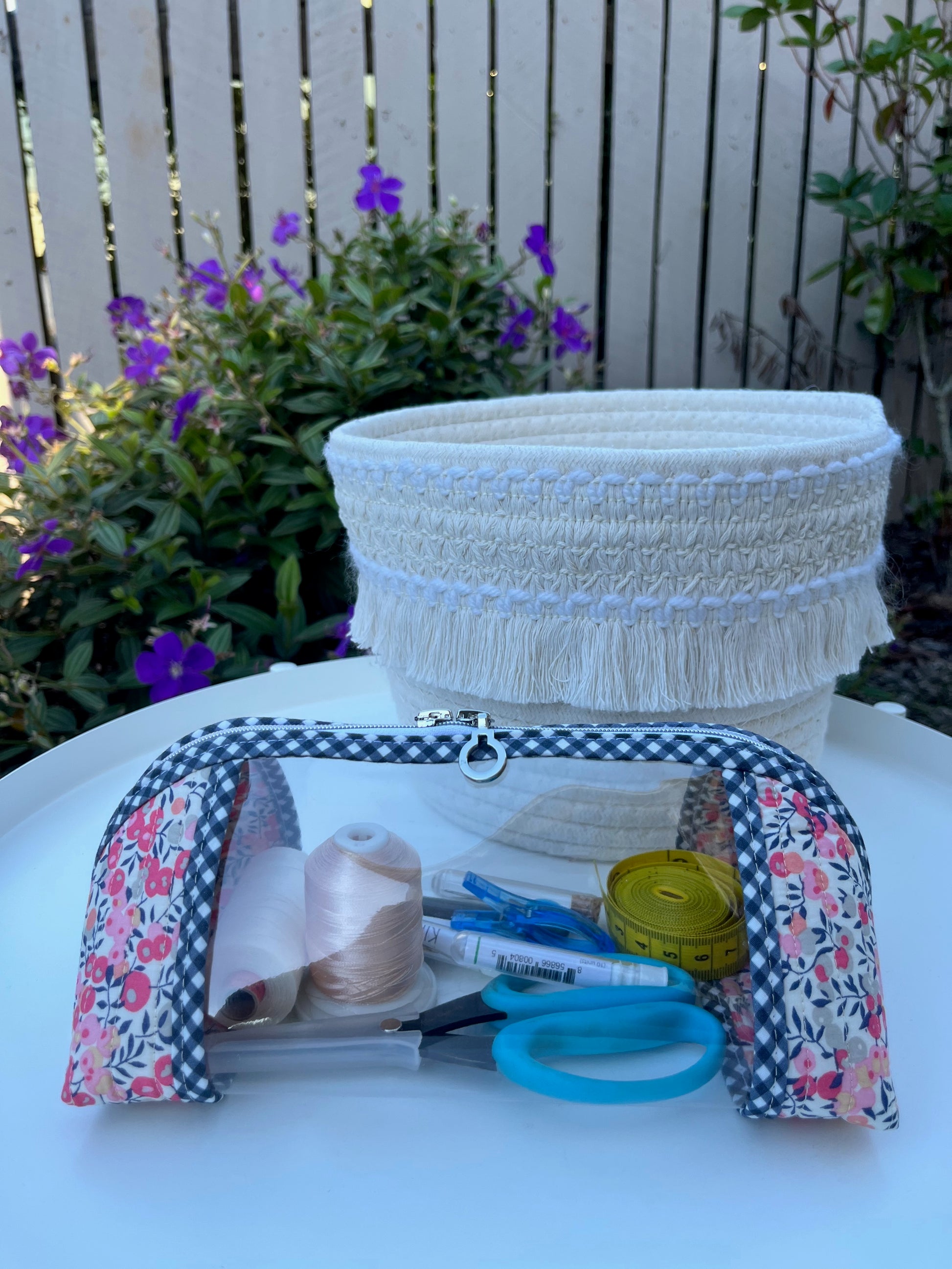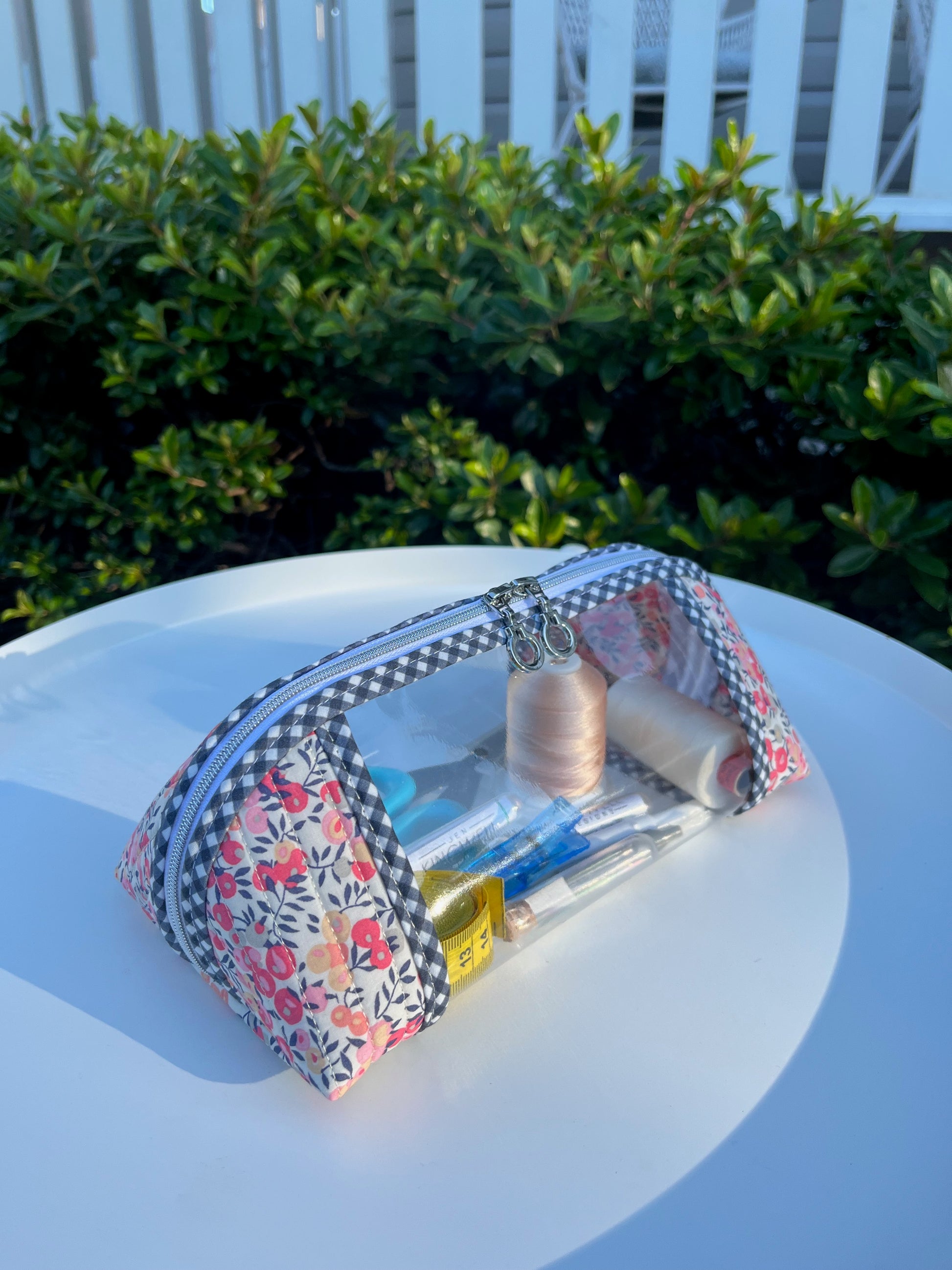 The Clearly Trixie Pouch is a transparent pouch that can be used to store and organise small items such as makeup, medication, toiletries or sewing supplies. The pouch features clear vinyl sides so that the contents can be easily seen and zipper closure. The finished pouch measures approximately 4" tall x 5" deep x 9.5" wide. A really useful pouch. This has been made with the beautiful 'Wiltshire D' design by Liberty. All products are handmade with attention to the finest detail, in my Toowoomba studio.